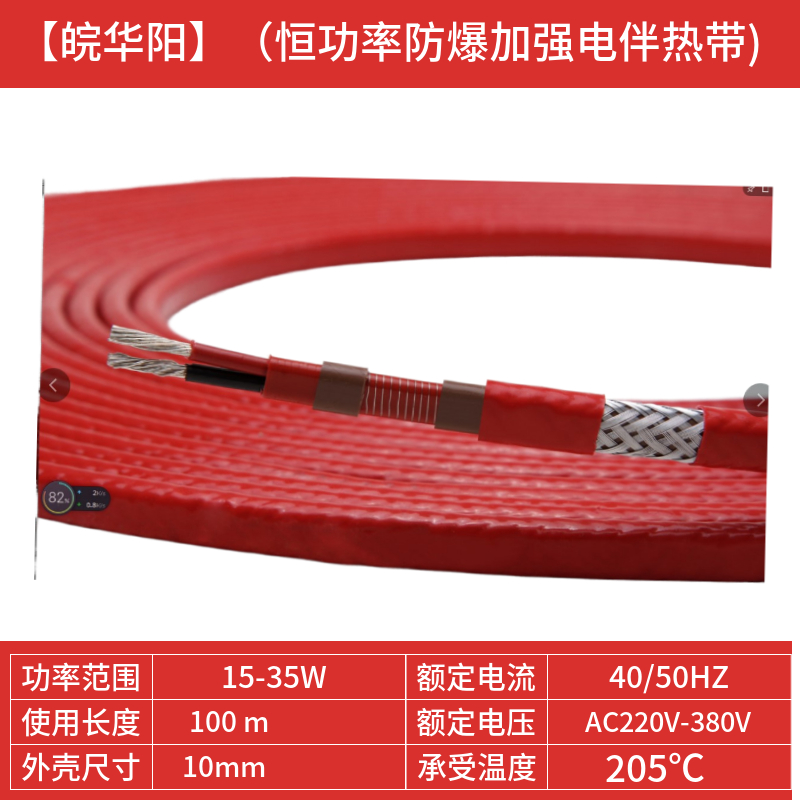 串聯式恒功率電伴熱帶:串聯式電伴熱帶是由絕緣銅絞線為電源母線,即為發熱芯線。具有一定內阻的芯線通過電流芯線就會產生焦耳熱量(焦耳--楞次定律Q=0.24I\S2^;Rt),其大小與電流平方、芯線阻值和通過時間成正比。因此串聯式電伴熱帶隨著通電時間的延續,源源不斷的發出熱量,形成一條連續的、均勻發熱的電伴熱帶。串聯式電伴熱帶芯線電流相同、電阻相等,所以整根電伴熱帶首尾發熱均勻,其輸出功率恒定不受環境溫度和管道溫度影響。