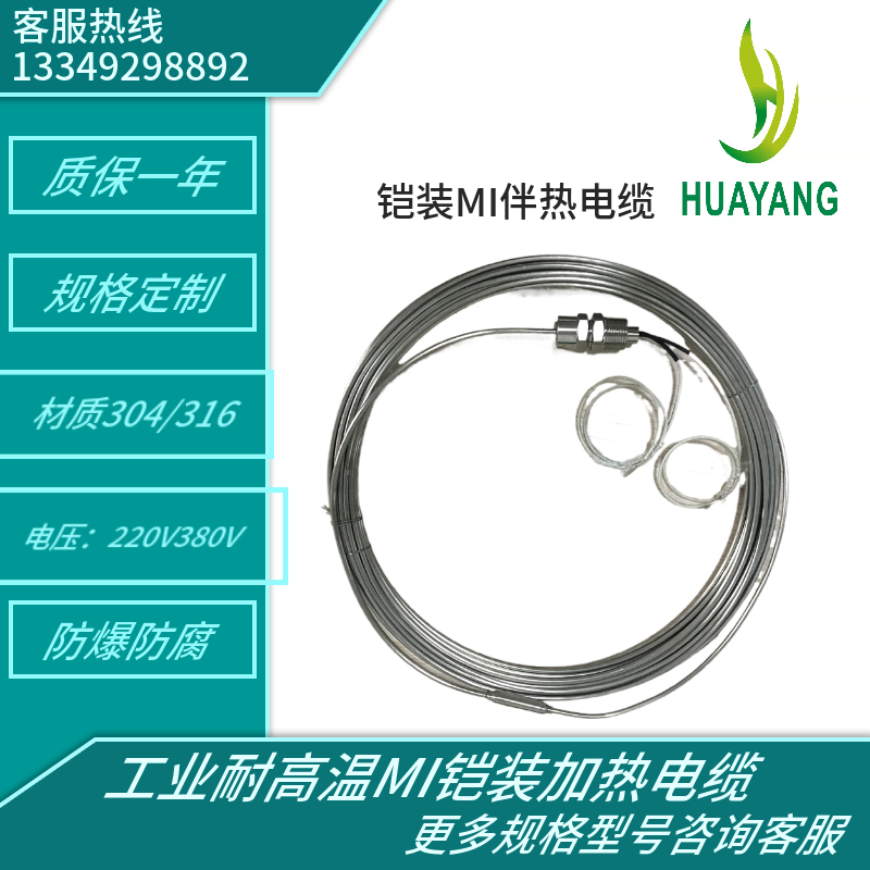 華陽單芯礦物絕緣(MI)加熱電纜HST-22D/220V不銹鋼護套系列礦物絕緣加熱電纜可以滿足高溫條件和大發熱功率(達269W/m)的需要。不銹鋼護套加熱電纜的最高承受溫度可達600℃;導體電阻值的范圍從2.1Ω/km到36100Ω/km;礦物絕緣電纜具有優良的機械強度,耐腐蝕。